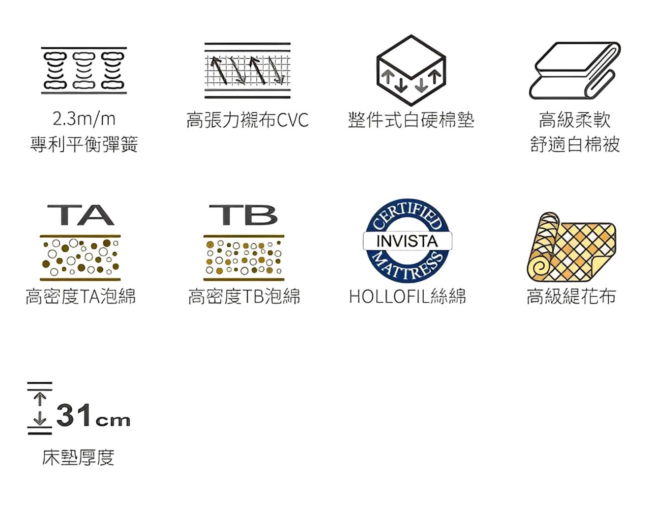 茱麗安特單舌 產品說明使用專利Spuhl燈籠型平衡彈簧,符合人體工學設計,耐用舒適。面材使用高級緹花布及INVISTA™專利HOLLOFIL®高彈性絲綿,貼身舒適,獨家設計,讓您輕鬆擁有一夜好眠。 3.5*6.2尺 5*6.2尺 6*6.2尺 6*7尺 31600元 42000元 49500元 56100元