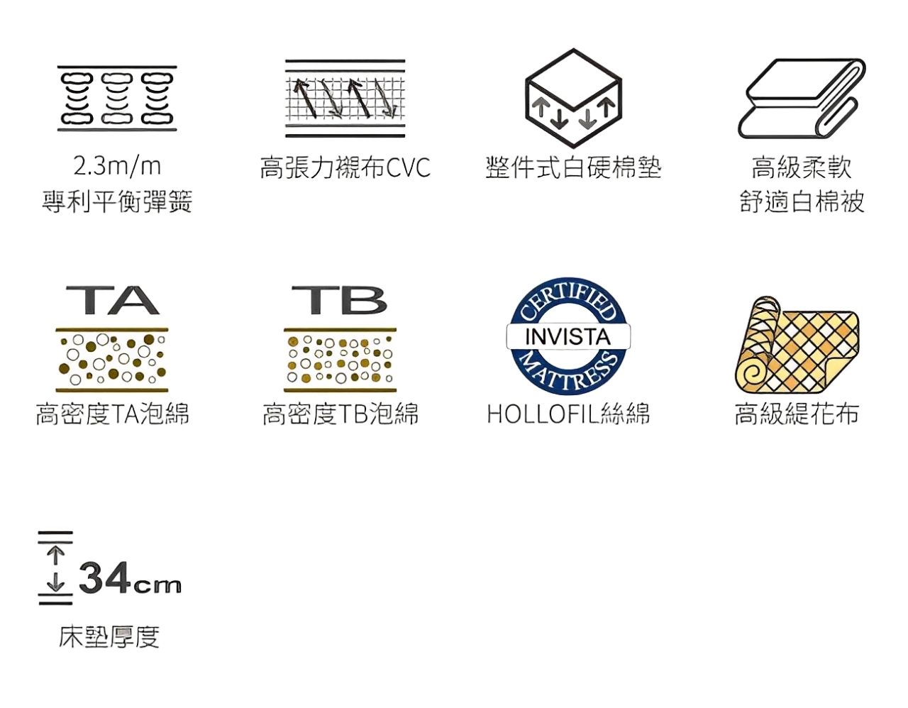 茱麗安特雙舌 產品說明使用專利Spuhl燈籠型平衡彈簧,符合人體工學設計,持久耐用、睡眠舒適。面材使用高級緹花布及INVISTA™專利HOLLOFIL®高彈性絲綿,貼身舒適,獨家專利設計,雙層舒適墊設計,提供身體更好的服貼度,是優質睡眠最佳選擇。 3.5*6.2尺 5*6.2尺 6*6.2尺 6*7尺 34800元 45800元 54200元 61400元