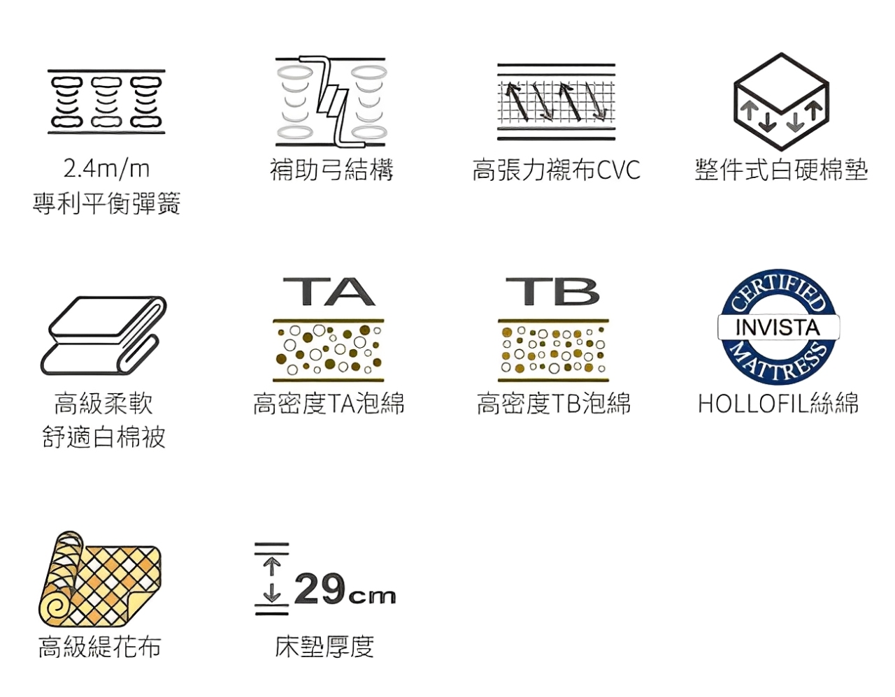 金黃茉莉 產品說明金黃茉莉系列為全新開發老K牌平衡硬式系列!採用2.4m/m平衡彈簧,雙層舒適襯墊的設計增加了豪華服貼舒適感,為一款有堅固支撐、豪華舒適兼備的床墊。特別推薦給習慣睡偏硬式床墊,並期望睡得舒服有舒適感的消費者。 3.5*6.2尺 5*6.2尺 6*6.2尺 6*7尺 27000元 37000元 43000元 48600元